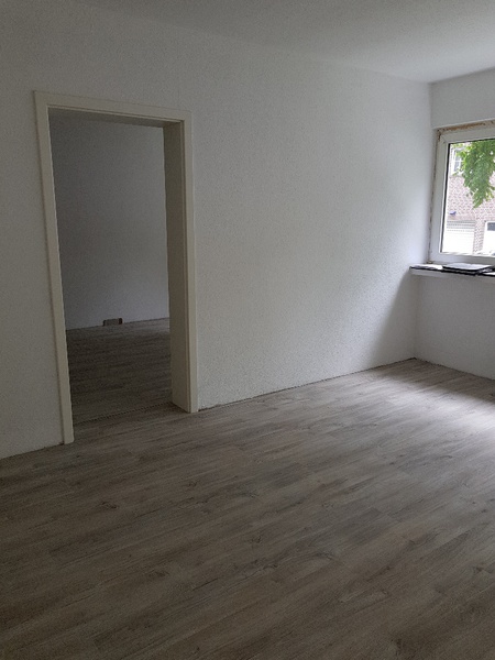 Alle Wände werden mit Rauhfasertapete tapeziert und weiß gestrichen. Diele, Küche und Bad sind mit Fliesenboden, Wohnräume mit Laminatboden ausgestattet.